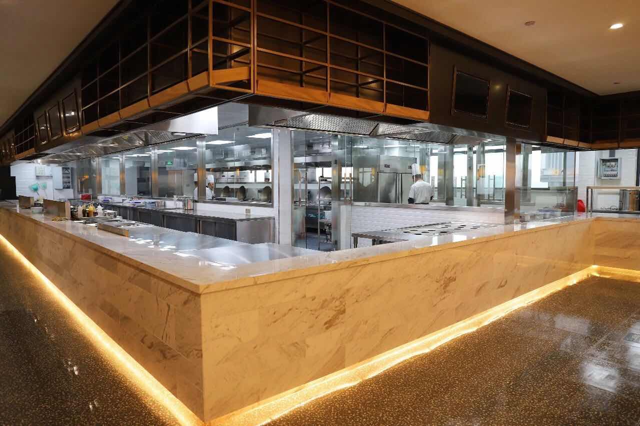 明檔設(shè)計相當(dāng)于一個舞臺,意在讓顧客從不同角度觀賞一場食材的制作過程和廚師精湛廚藝結(jié)合的表演。在這個四面通透的舞臺下廚,如果吸力不夠,油煙容易往外跑,這樣一來便毫無觀賞感可言,明檔的美觀意義也隨之失去。